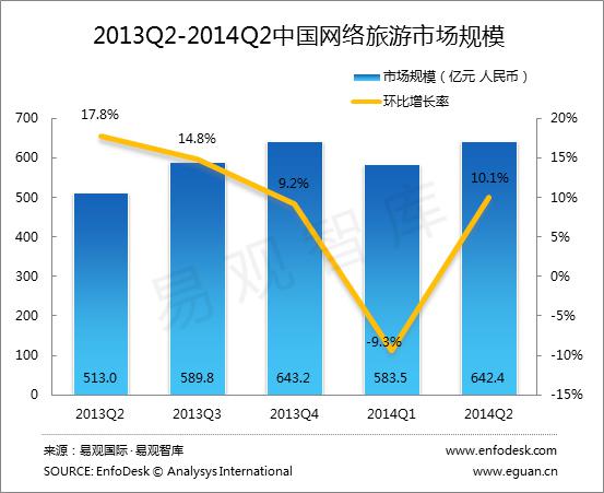 2014年第2季度中国网络旅游市场规模达642.4亿