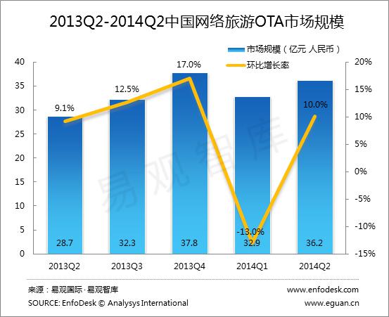 易观智库《中国网络旅游市场季度监测报告2014年第2季度》数据显示,2014年第2季度中国网络旅游市场规模达642.4亿元,同比增长25.2%,环比增长10.1%;中国网络旅游OTA市场规模达36.2亿元,同比增长26.1%,环比增长10.0%。第2季度网络旅游季节性复苏趋势明显。