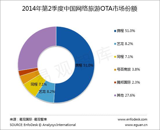 2014年第2季度携程仍稳居OTA市场份额第一,达到51.0%。2014年第2季度携程通过入股同程、途牛实现度假旅游市场领先地位的确立,对于网络旅游产业链的渗透和控制力得到巩固。EnfoDesk易观智库分析认为,携程通过投资入股的方式布局个人度假旅游,已形成商务旅游和个人度假旅游业务两条业务线支撑的商业模式,在近年来一系列基于产业链整合的投资行为中,携程在旅游上下游业务覆盖面大幅增加,有助于打造支付闭环,推进自身支付渠道建设,实现“旅行+金融”的战略目标。