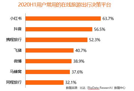 报告显示,2020上半年度,用户在进行旅游决策时,对传统OTA平台、旅行垂直社区依赖降低,而更多使用小红书、抖音等内容社区和平台。其中生活方式社区小红书是用户最常使用的旅游出行决策平台,有63.7%用户使用;其次是抖音,有56.5%的用户使用。