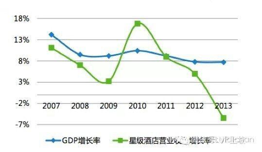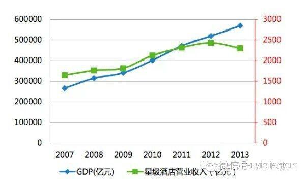 2011年后,星级酒店营业增长速度跑不赢GDP,2013年甚至出现负增长。