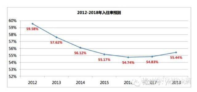 就在这样的环境下,未来高端酒店数量仍在增长。据STR统计,未来5年中高端酒店将新增客房23万间。据预计,未来酒店出租率仍会持续下滑,到2016年出现波谷。