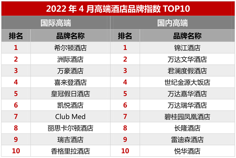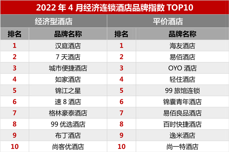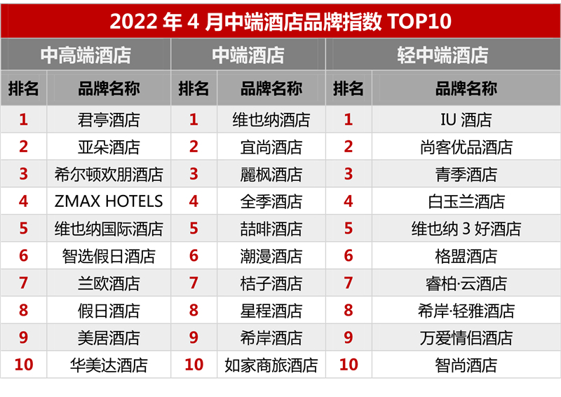 以下是迈点研究院独家发布的“2022年4月酒店品牌影响力100强榜单”。本月, 维也纳酒店、宜尚酒店、希尔顿酒店位列前三甲,另有锦江酒店、麗枫酒店、洲际酒店、汉庭酒店、7天酒店、君亭酒店、城市便捷酒店进入榜单前十。本月100强榜单中,共有46个品牌排名环比上升,38个品牌排名环比下降,2个品牌排名没有发生变化。本月共有12个酒店品牌新晋百强榜单,分别为:如家精选酒店、万达瑞华酒店、宜必思酒店、丽晶酒店、朗丽兹酒店、骏怡酒店、派酒店、都市118连锁酒店、华驿酒店、贝壳酒店、维也纳3好酒店和青季酒店MINI。