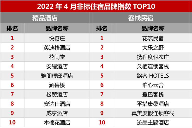 2022年4月类型榜单中,中端酒店品牌类型数量最多,有410个;平价酒店品牌类型数量最少,只有42个。从品牌指数来看,国际高端最高,品牌指数均值为237.40;客栈民宿最低,品牌指数均值为150.09。从4月各类型品牌发展态势来看,高端酒店多集中在疫情应对措施、品牌迭代更新、酒店集团扩张布局、直播预售营销创新等;中档酒店市场中,市场扩张、产品特色化、服务智慧化、精准营销、新盈利模式探索成为品牌关注热点;经济连锁酒店在疫情期间复苏缓慢,品牌在经营管理、人才建设、产品服务等方面存在的问题更加凸显,主要以品牌整合、内修功法优化服务为重点;非标住宿则在加强供应链能力打造、搭建品牌营销和数据能力等,丰富民宿销售场景和渠道,构建民宿短视频直播带货新生态。