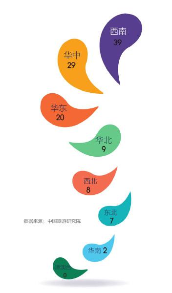 从区域分布来看,西南地区由于地形地貌丰富多样,围绕景区开发的旅游投资表现最为活跃,以39个新增景区稳居榜首。华中地区则以29个新增景区排名第二,其中湖南省增加5A 级景区最多,分别是韶山旅游区,张家界武陵源—天门山森林公园,岳阳楼—君山岛景区。