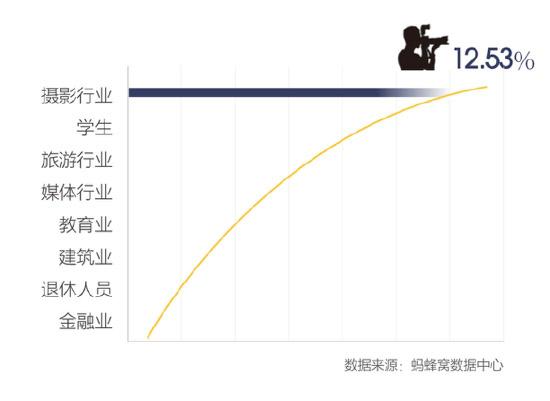新开发的自然景观景区中,每10位游客中就有1位是摄影工作者,占到了12.53%,其他职业依次是:学生、旅游行业、媒体行业、教育业、 建筑业、退休人员以及金融业的从业人员,总体职业集中度逐渐减弱。