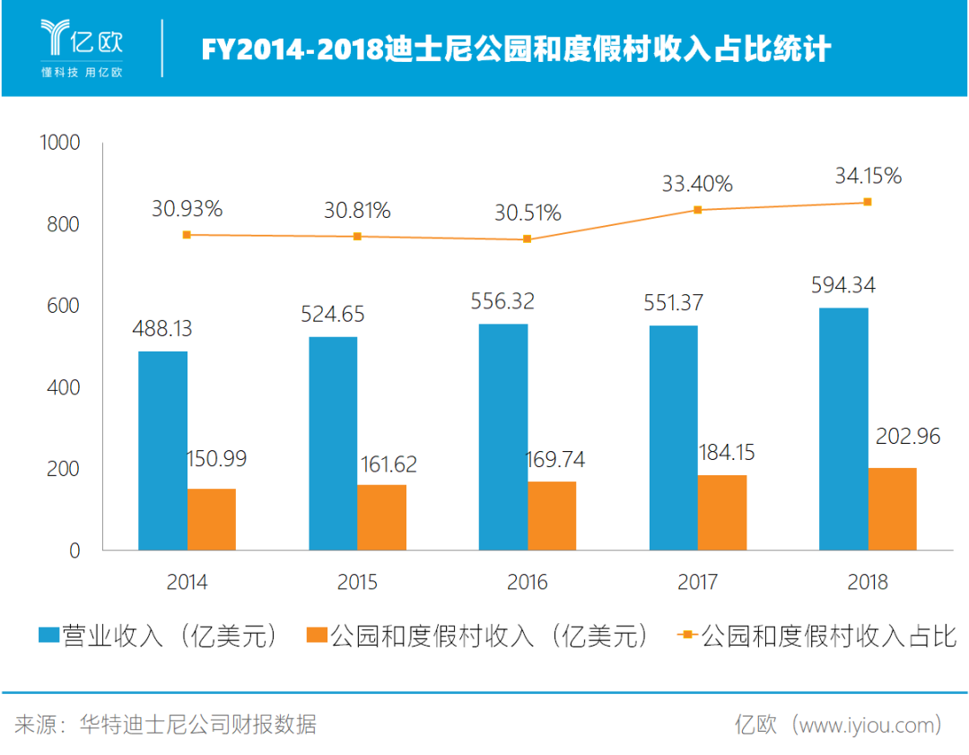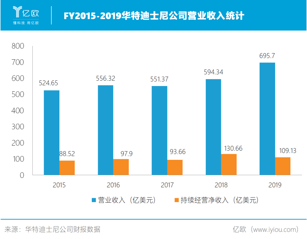 近五年迪士尼的营业收入持续上升,但持续经营净收入却在2019财年有所下降。按照华特迪士尼公司2019财年数据计算,其位于亚洲和法国的四个迪士尼乐园仅占主题公园总收入的19.56%。