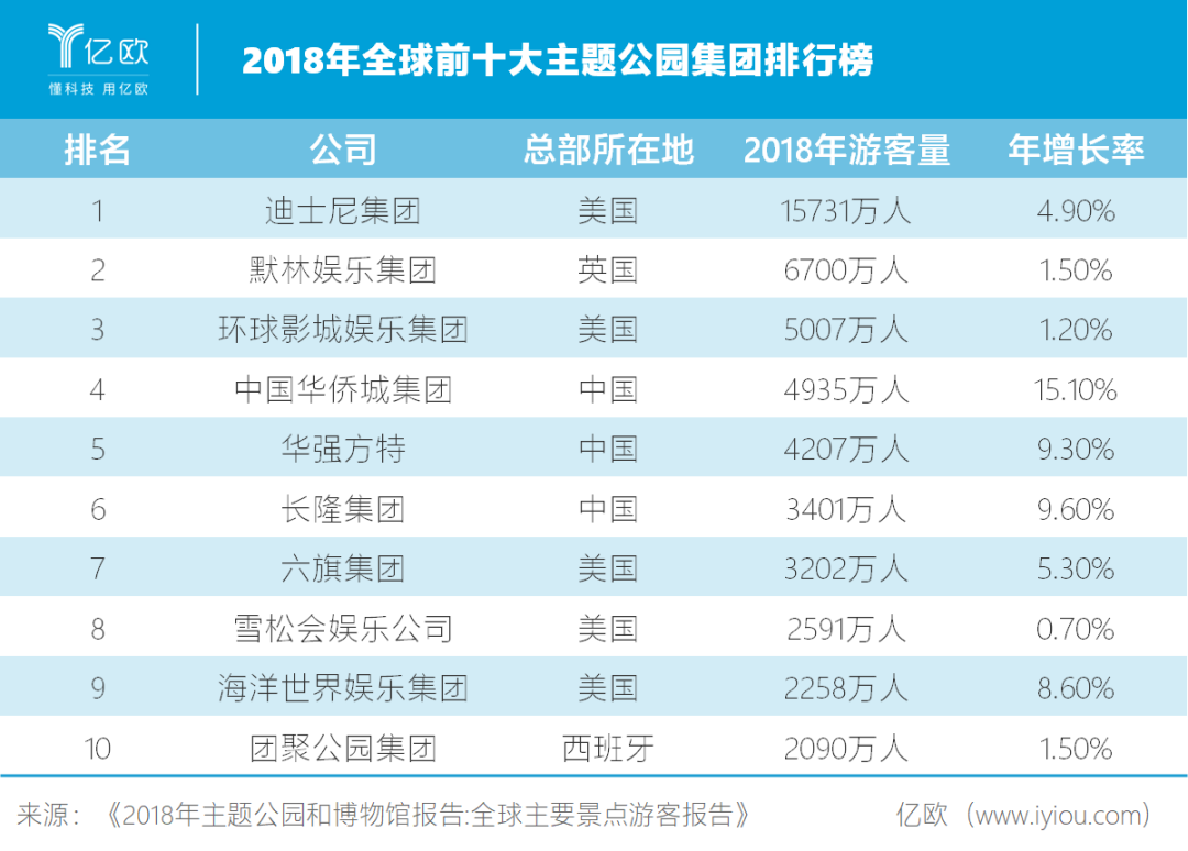 中国本土主题公园集团华侨城、华强方特和长隆集团游客量相加仅占迪士尼的80%左右,不过增长率较高,分别为15.1%、9.3%和9.6%。