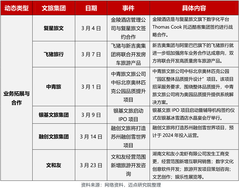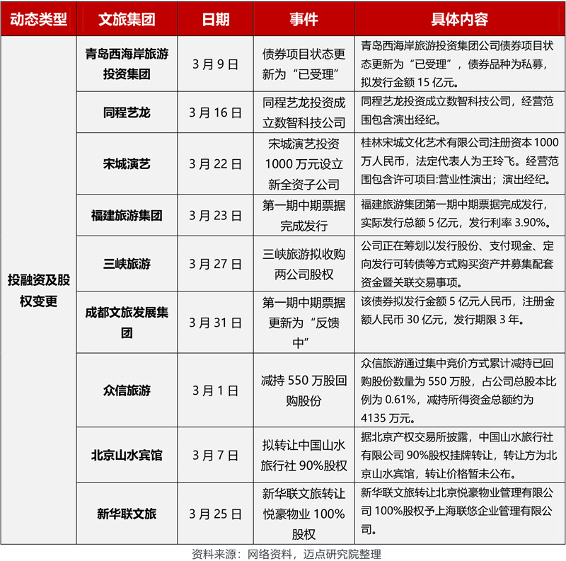 3月,在文旅集团动态方面,各文旅集团动向包括人事变动、新增文旅集团、战略合作、文旅集团改制、业务拓展、文旅集团投融资、股权变更等。