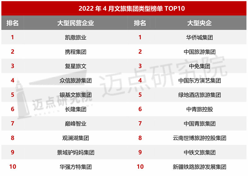 本月,华侨城集团、曲江文旅、凯撒旅业位列前三甲,另有携程集团、中国旅游集团、复星旅文、锦江国际集团、康旅集团、中免集团、中国东方演艺集团进入榜单前十。