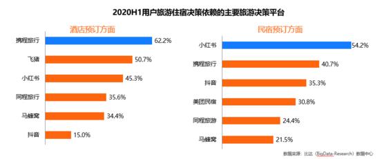 报告显示,2020上半年度,用户在进行旅游决策时,对传统OTA平台、旅行垂直社区依赖降低,而更多使用小红书、抖音等内容社区和平台。其中生活方式社区小红书是用户最常使用的旅游出行决策平台,有63.7%用户使用;其次是抖音,有56.5%的用户使用。