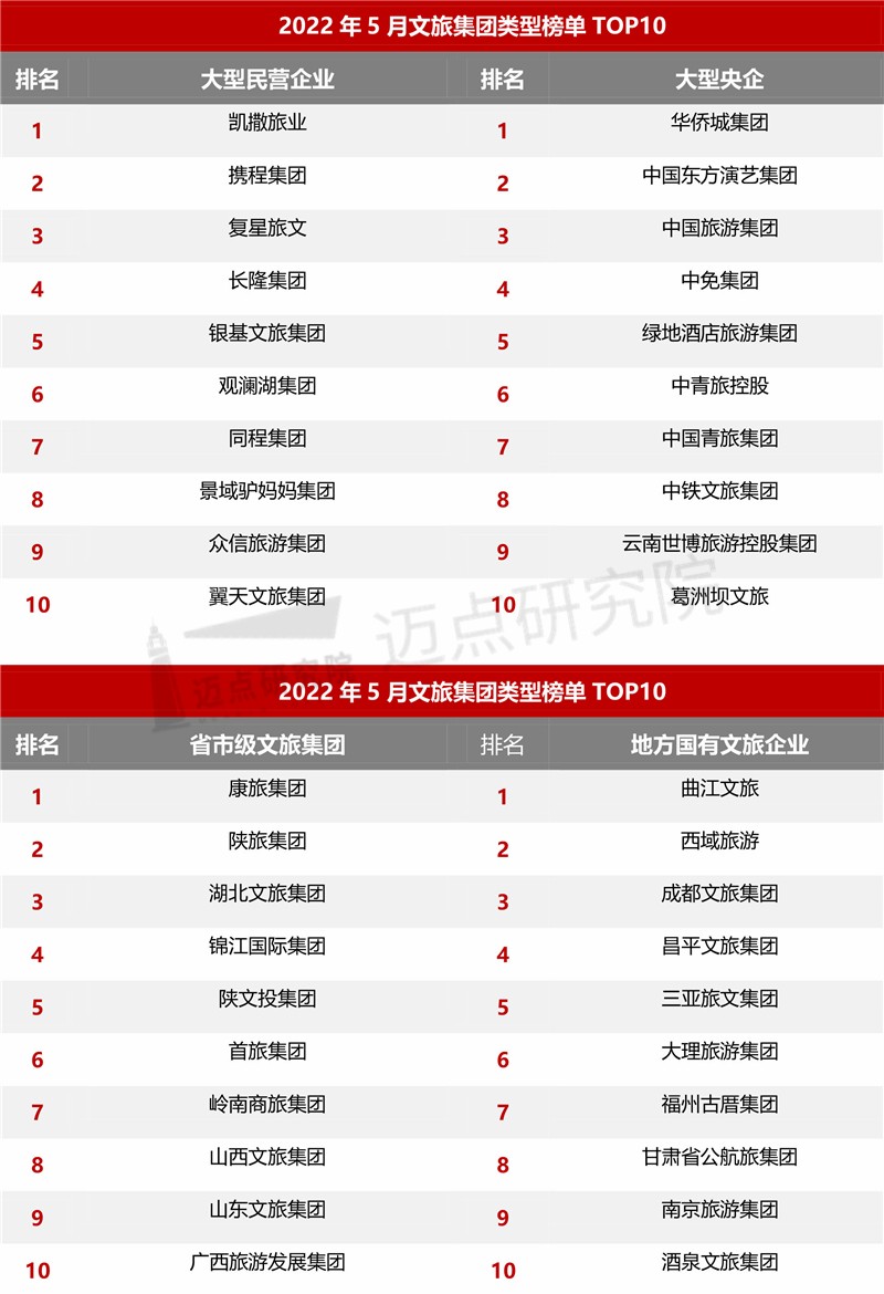 从主流指数均值来看,5月整体文旅集团品牌主流指数均值为4.55,环比下降11.31%;TOP100文旅集团品牌主流指数均值为27.88,环比下降7.50%。5月文旅集团主流媒体关注度前十的是凯撒旅业、中国东方演艺集团、携程集团、中国旅游集团、华侨城集团、曲江文旅、锋尚文化、陕旅集团、复星旅文和康旅集团。