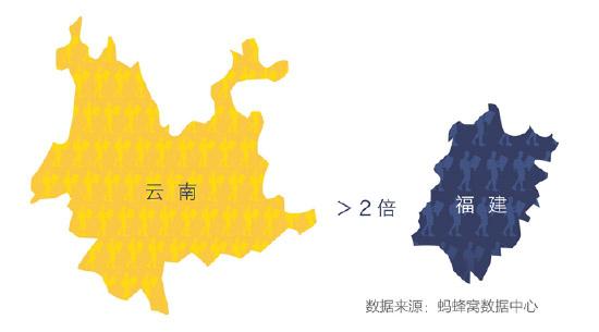根据蚂蜂窝的90后用户行为数据, 喜欢云南的90后人数是福建的2倍多。