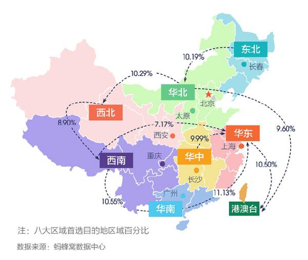 28.29%的国人偏好以华东地区为旅游目的地。虽然人们都向往远处的风景,但是西南地区的用户更偏好自己所在的区域,41.35%的西南地区用户首选的旅游目的地还是自家的一亩三分地。另外,10月全国出游人群总数中,只有5.6%是东北用户,10.19%的东北用户偏好华北地区。