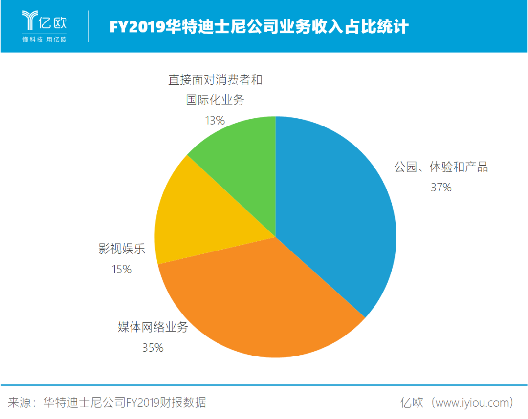 在2019财年中,华特迪士尼公司将“体验和产品”收入划归到了公园和主题乐园业务的收入中,该板块业务的收入占比达到了37%。