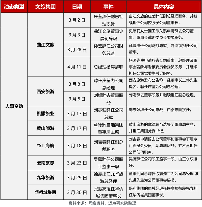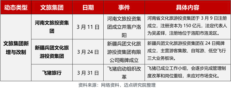 3月,在文旅集团动态方面,各文旅集团动向包括人事变动、新增文旅集团、战略合作、文旅集团改制、业务拓展、文旅集团投融资、股权变更等。