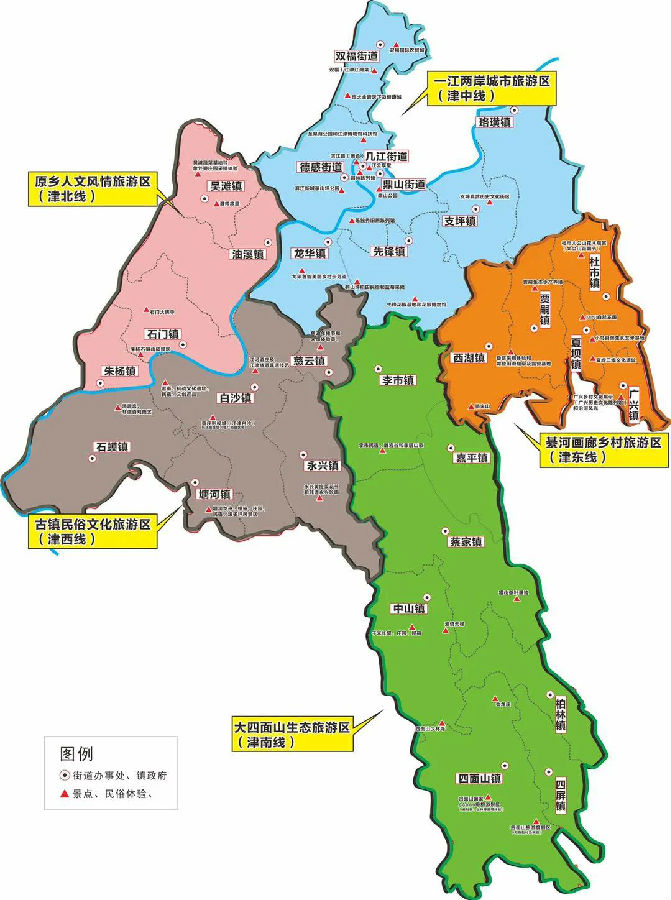 古镇民俗文化游(津西线)拥有石蟆、白沙、塘河3个中国历史文化名镇,有“长江入渝第一岛”——中坝岛,西南地区保存最完整、规模最大的明清建筑清源宫,重庆影视城等;